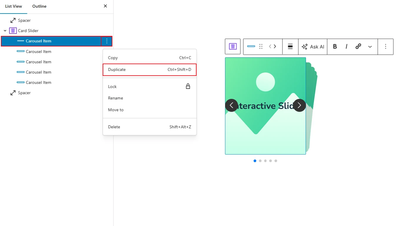 You can also duplicate any existing slide item to add a new item. To duplicate any existing slide item, first, select the item that you want to duplicate. Then click on the 3 dots to open the actions panel. You can select the block for duplicating using the List View or Toolbar. For example, we want to use the List View to duplicate our first site. It looks like this: